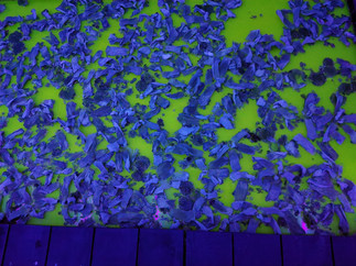 Und ja, die Flutung des halben Museums, welch geniale Idee und wundersame Ausführung. Die leuchtend grüne Wasserfläche zieht sich von draussen, wo sonst ein bescheidener Teich ist, einfach hinein ins geöffnete Gebäude. Auf schönen Holzstegen können wir das Wasser erwandern, sehen die Spiegelung der Architektur und die verschiedenen Wasserpflanzen, die im giftgrünen Wasser fast surreal wirken. Die Enten sind definitiv lebendig und nehmen das Publikum gelassen in Kauf. Gerne würde man schauend und sinnierend auf der Wiese sitzend verweilen, um länger das spiegelnde Wasser zu geniessen – uns war das des Wetters wegen nicht vergönnt. Aber dann sind wir abends um 22 Uhr zurückgekommen, um das Wasser bei Nacht zu sehen. Ganz anders wirkt die Installation jetzt, viel artifizieller unter der violetten Decken- und blauen Wandbeleuchtung. Den Enten gefällt’s auch so - und der Andrang der BesucherInnen ist gross! (Rondin/Arp bis 16.5.; Life bis Juli 2021, rund um die Uhr offen!)
