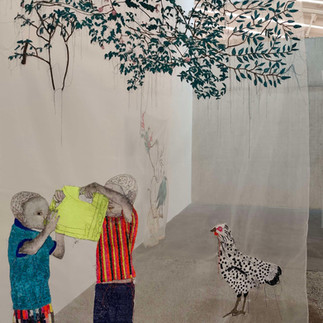 Photos: whispering systems, von Julia Steiner (Basel), Objekte aus verkupferten Drähten / Kohlezeichnungen brennender Wälder von Nohemi Pérez (Kolumbien) / mit Cyanotypie (googeln!) entstandene Pflanzenbilder von Lena Laguna Diel (Spanien/Schweiz) / auf durchsichtige Gazestoffe gestickte Szenen prekären Lebens von Ana Silva (Angola) / Soundinstallation von Surma (Portugal) / Der Rhein von der Quelle in den Alpen bis zur Nordsee, 8 (von 24) Rundgemälden (Auswahl). Unbedingt schauen gehen! Bis 17. August 2025