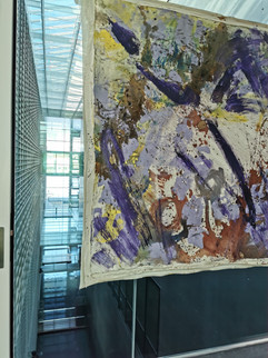 VIVIAN SUTER im Kunstmuseum Luzern Man betritt den grossen Ausstellungssaal und gleichzeitig fast einen Wald voller Farben und Bilder. Grosse, bemalte Leinwände hängen dicht neben- und übereinander an den Wänden und von der Decke. Man sucht sich seinen Weg, kann sich drehen, umkehren, einen andern Weg gehen – und kommt aus dem Staunen nicht heraus. Die grossformatigen Leinwände sind sehr unterschiedlich bemalt, von wenigen leichten Pinselstrichen bis zu leuchtend farbig ausgemalten Flächen, wenig Gegenständliches, angedeutete Figuren, meist fliessende Farbbewegungen. Alle diese Bilder entstanden in Vivian Suters Atelier/Wohnhaus in Guatemala, wo sie seit Jahrzehnten lebt, im tropischen Regenwald nahe der Stadt Panajachel. Die Anzahl der Werke und die Art des Hängens gibt ein ganz neues Ausstellungsgefühl, so dicht umgeben von Kunst ist man selten! Es sind auch einige ihrer früheren Werke zu sehen, dick mit intensiven Farben bemalte, vieleckige Bilder auf Papier, die «Unförmigen». Und in einem andern Raum die Collagen ihrer Mutter, der Künstlerin Elisabeth Wild, die lange Jahre mit ihrer Tochter in Guatemala gelebt hat. Sehr schön auch der Film über die beiden Frauen und ihr Haus inmitten der dichten, üppigen Vegetation, zusammen mit einigen indigenen Helfer:innen und ihren drei Hunden. (Bis 13.02.2022)